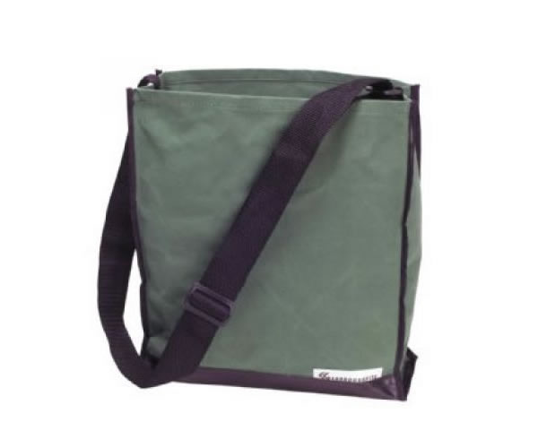 Confeccionada em lona impermeável na cor verde, com reforço no fundo.