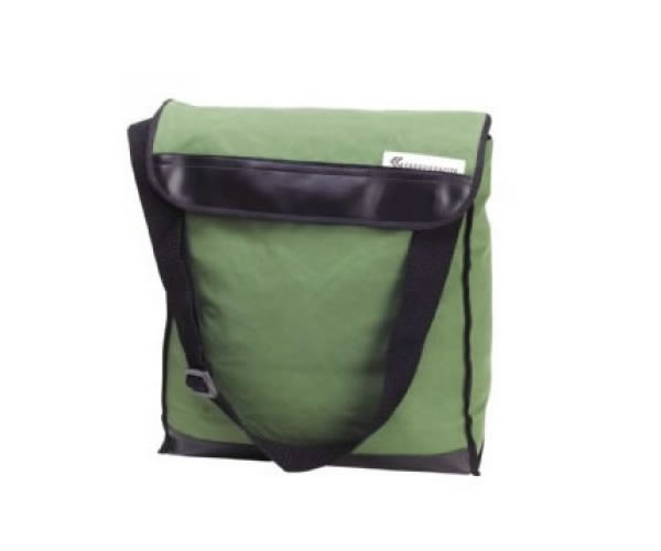 Confeccionadas em lona impermeável na cor verde, com reforço no fundo.