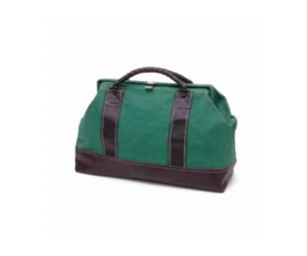 Confeccionada em lona impermeável na cor verde, com reforço no fundo e nas laterais, costura com linha de nylon.